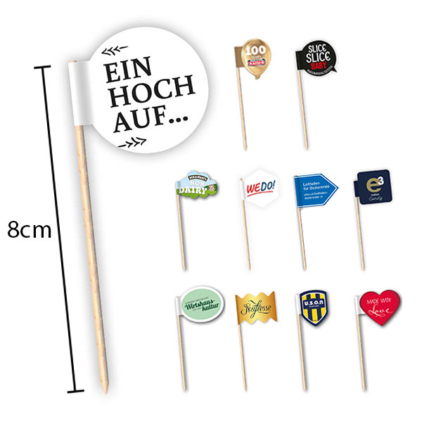 Sie sind auch bekannt als Minifähnchen, Käsepicker, Zahnstocherfähnchen, Partypicker oder Fähnchenpicker. Wir bedrucken sie hier in Vollfarbe im Digitaldruck.